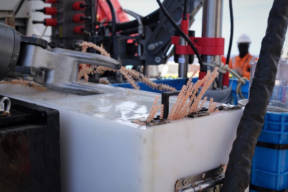 还没等“蛟龙号”在后甲板完全停稳,来自墨西哥的科学家埃里卡便凑上前。她惊喜地发现,海绵上竟有共生的黑色和紫色珊瑚!她拿来装有冰块的样品箱,小心翼翼地将样品转移到船上的生物实验室。