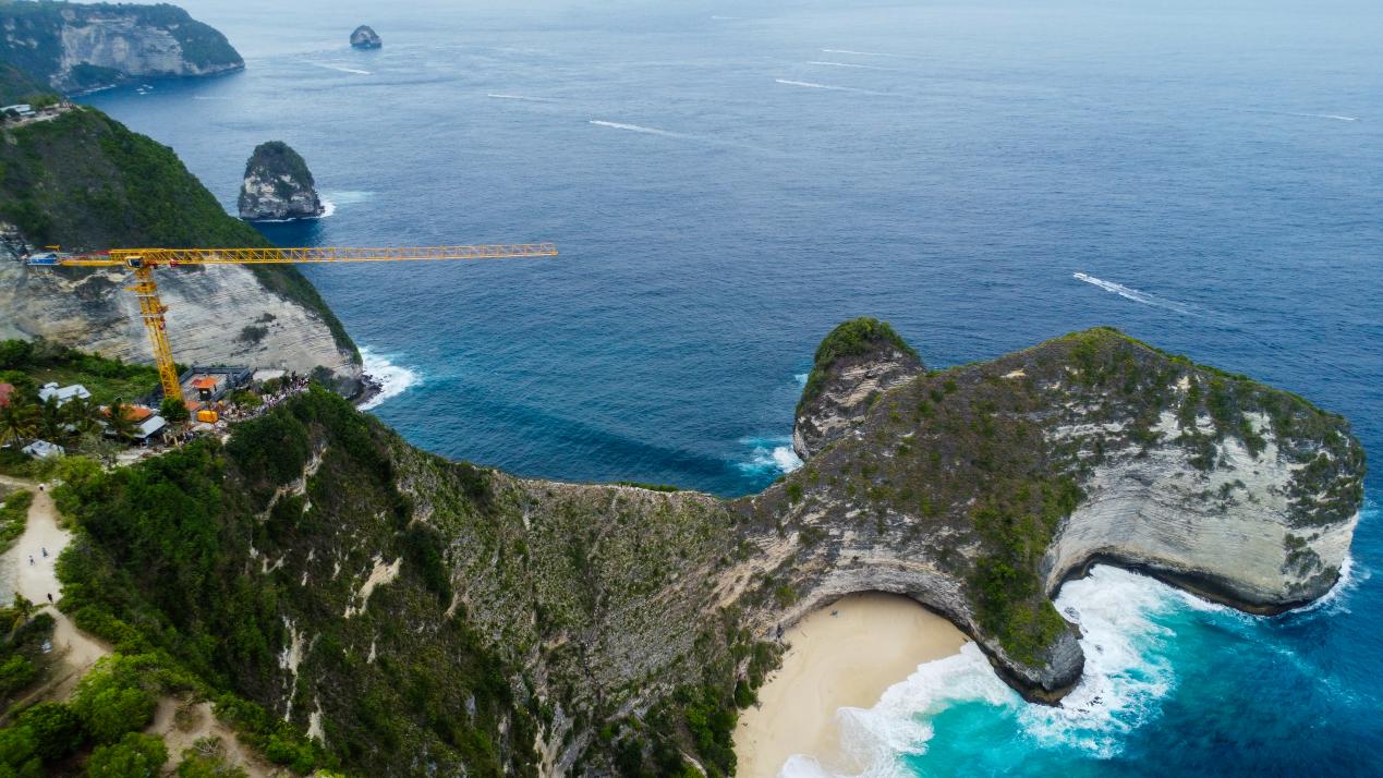 这是在旅游胜地印尼巴厘岛精灵海滩,徐工塔机参建“世界第一悬崖观光电梯”的场景。