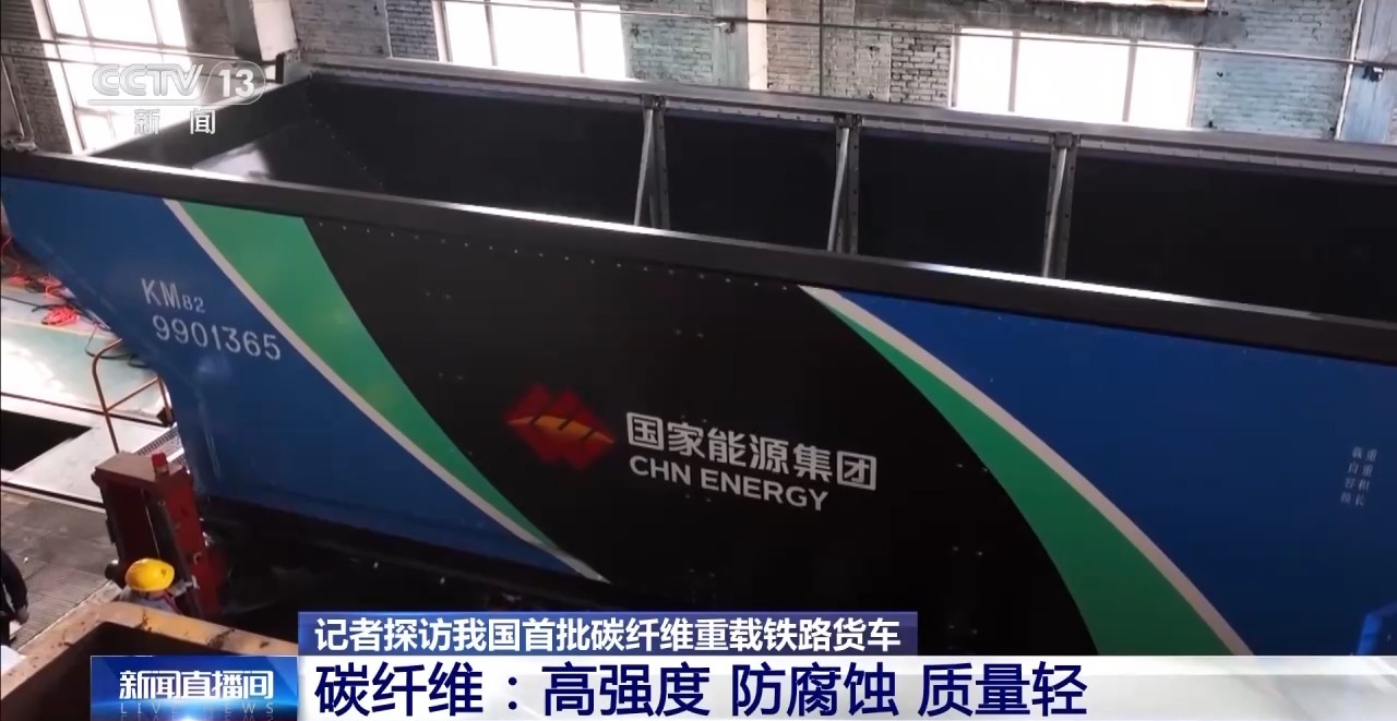 总台央视记者古峻岭:碳纤维重量特别轻,它标注是自重18吨,而同样规格的钢材至少是要24吨,这一节车厢就轻了6吨,也就意味着可以多装6吨的货。