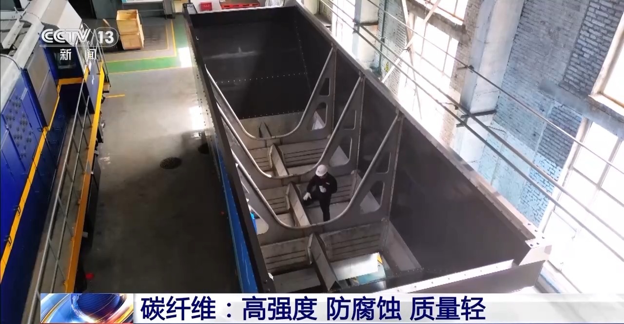 总台央视记者古峻岭:碳纤维有着一些非常优异的性能,比如说它的强度是钢铁的3—5倍,它的重量却只有钢铁的1/5,同时它还有非常优异的抗腐蚀能力。