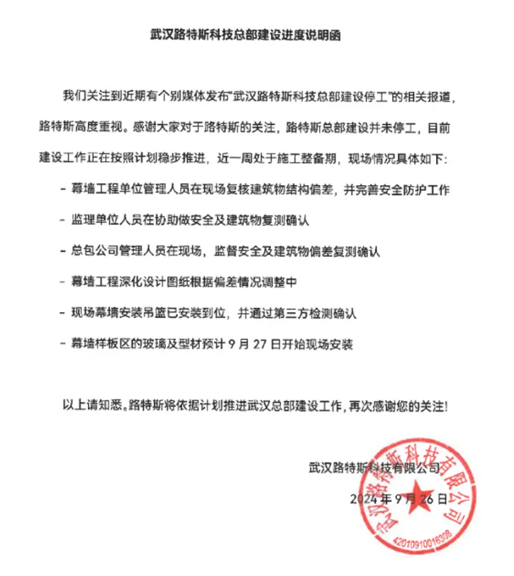 随后路特斯针对武汉总部建设停工的传闻发布《武汉路特斯科技总部建设进度说明函》。官方表示,特斯总部建设并未停工,目前建设工作正在按照计划稳步推进,近一周处于施工整备期。路特斯将依据计划推进武汉总部建设工作。