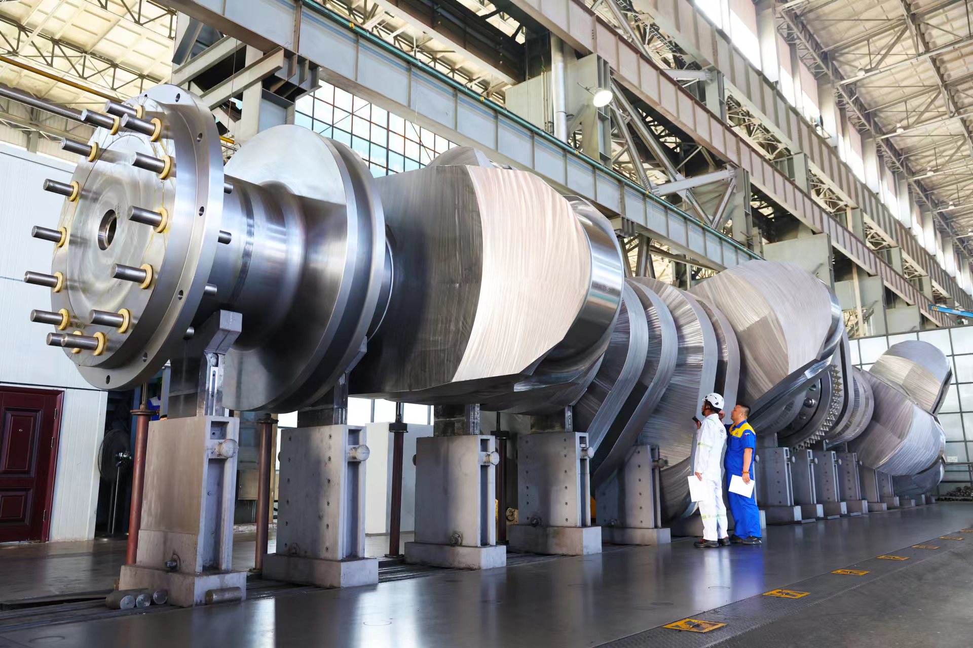 据了解,12G95ME-C10.5船用曲轴采用对接式结构,总长度23.67米,重量达到539吨,它是由MAN专利公司研发的缸径最大、全球首款用于甲醇双燃料推进发动机上的关键部件,随发动机安装在中国首次制造的全球首批世界最大、最新型24000TEU(20英尺标准箱)甲醇双燃料动力集装箱船上。该支曲轴由于是全球首制,无任何依据可供参考,给制造、加工带来巨大挑战。为此,大连华锐船用曲轴有限公司全面对加工工装进行了升级改造,并在加工工艺优化、刀具选用上进行了大胆创新和提升改进,最终成功攻克了曲拐加工回转直径超限及超重等近10项技术难点,所有检测数据全部满足质量规范和图纸要求。值得一提的是,从曲轴毛坯进厂到完成最终检验,大连华锐船用曲轴有限公司凭借着成熟的技术经验,仅用57天完成了这个“大家伙”的出产下线,创下了企业超大对接型曲轴出产的最快纪录。