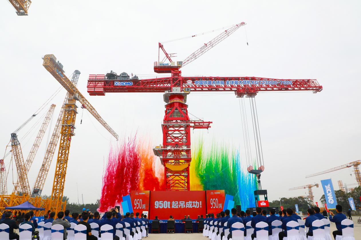 仪式现场,全球最大塔机XGT23000-760S顺利完成1.25倍动载起吊,吊装重量达到950吨。