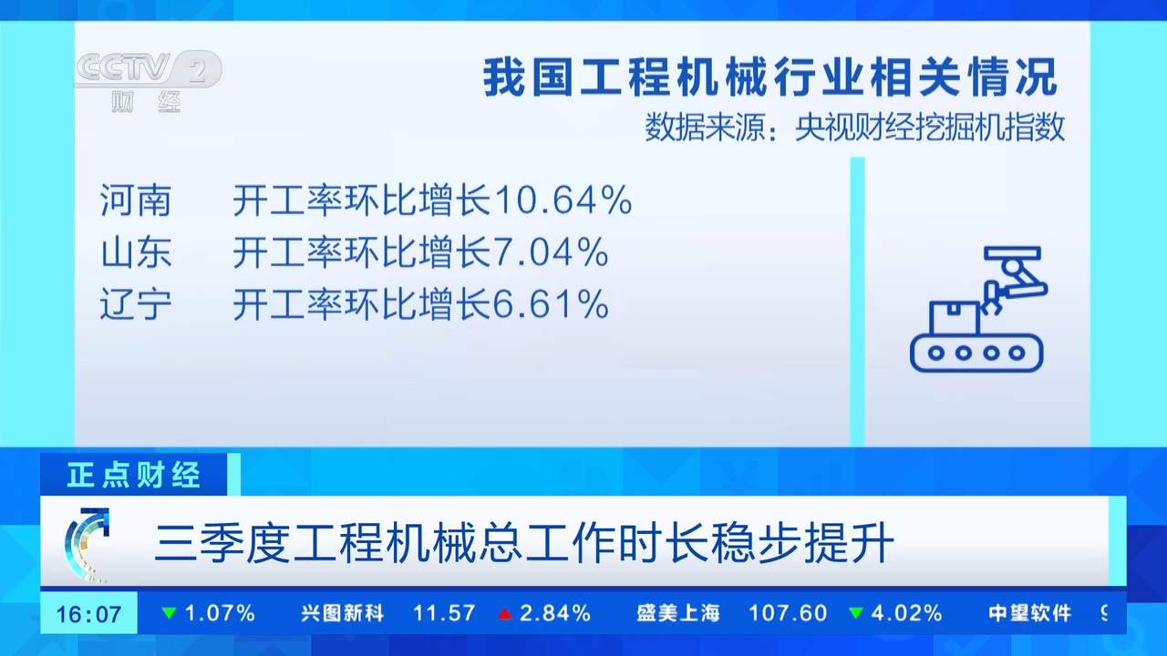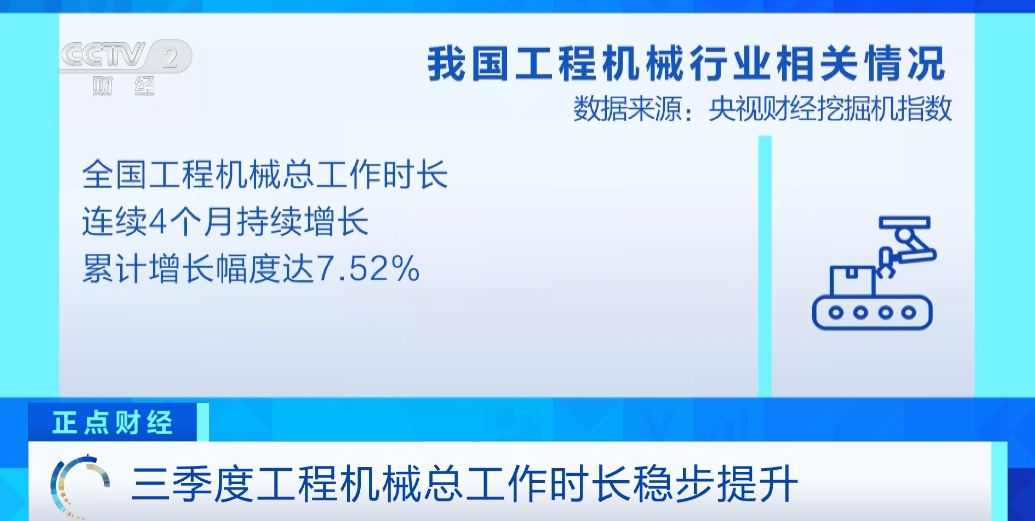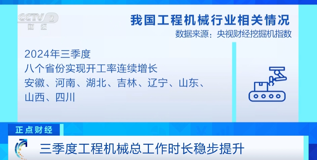 (央视财经《正点财经》)“央视财经挖掘机指数”今天发布了最新数据。其中显示,三季度,我国新建项目逐渐增多,全国工程机械总工作时长稳步提升。