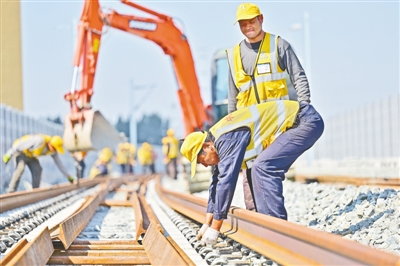 10月24日,随着首对500米的长钢轨精准落位,中铁七局承建的河南省郑州至开封城际铁路延长线正式进入铺轨阶段(上图)。