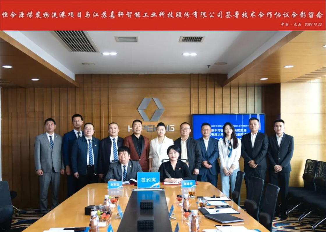2024年10月25日,原平市恒合源物流有限公司(以下简称“恒合源”)与江苏嘉轩智能工业科技股份有限公司(以下简称“中国嘉轩”)正式签署合作协议,将共同推进恒合源散装内陆物流港项目中的高压大功率永磁电动滚筒建设。此次合作,响应了国家发改委关于加快铁路专用线建设的要求,致力于打造省级重点工程的引领示范效应,推动亿吨级绿色低碳智能化散装物流港顺利落地。