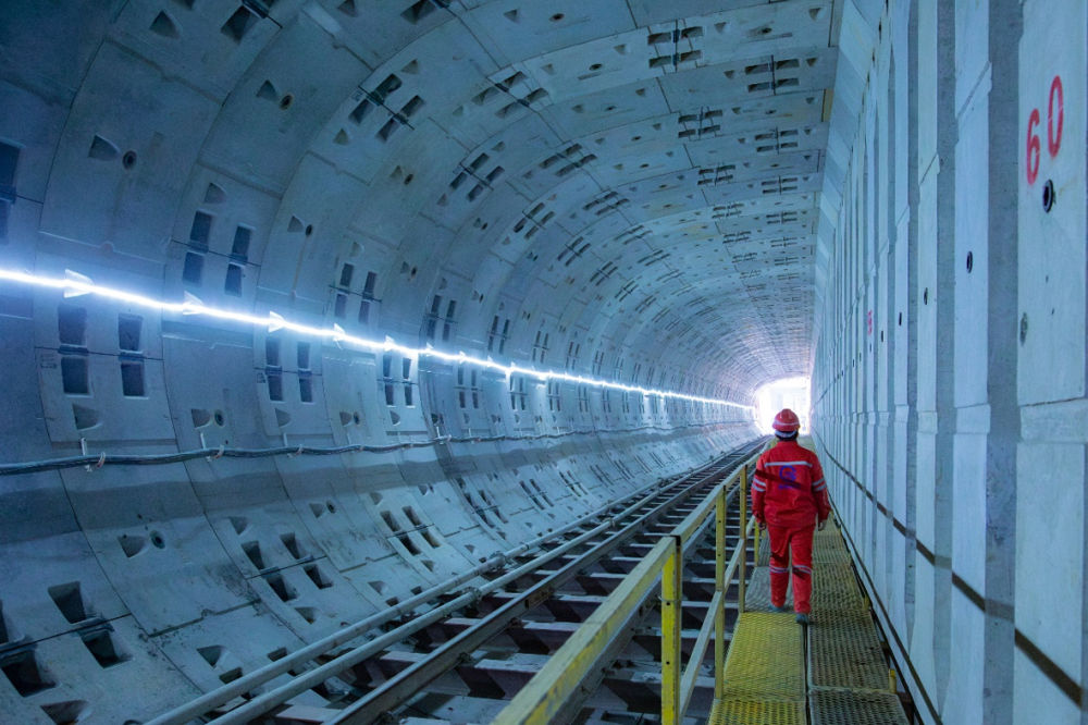 现场工程师正在检查“类矩盾构”完工后“单洞双轨”的隧道情形。