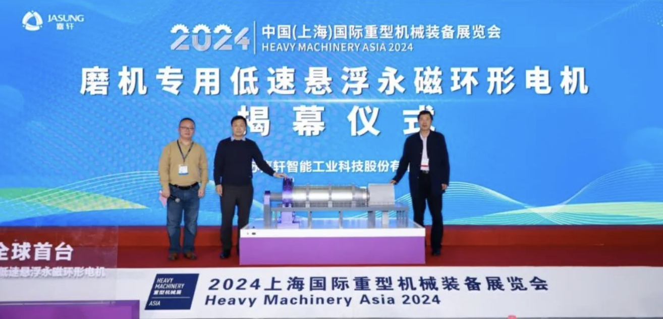 11月7日,在上海国际重型机械装备展上,嘉轩(JASUNG)以“创新驱动全球首发”为主题,重磅发布了新一代磨机专用低速悬浮永磁环形电机(以下简称“永磁环形电机”),为矿山设备提供革命性的驱动方案。永磁环形电机突破传统设计,将转子极直接安装在磨机本体上,使磨机本身成为电机的重要组成部分,通过磁场传递扭矩,无需齿轮或直接接触,不仅大幅提升了驱动系统的效率和可靠性,更显著降低了能耗和维护成本。