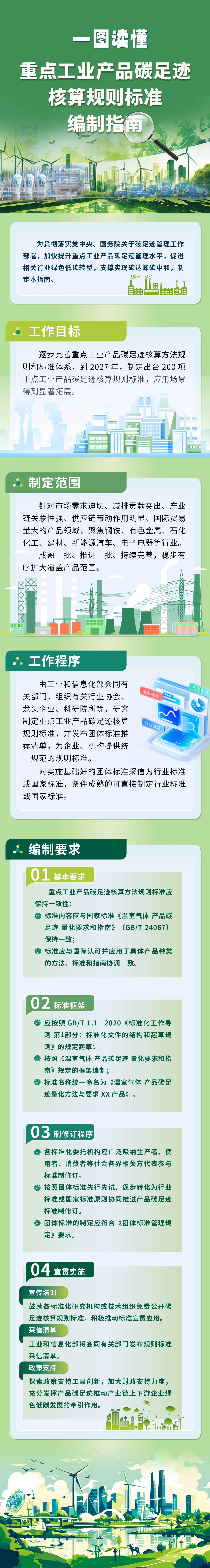 (三)明确工作程序。由工业和信息化部会同有关部门,组织有关行业协会、龙头企业、科研院所等,研究制定重点工业产品碳足迹核算规则标准,发布团体标准推荐清单,为企业、机构提供统一规范的规则标准。对实施基础好的团体标准采信为行业标准或国家标准,条件成熟的可直接制定行业标准或国家标准。