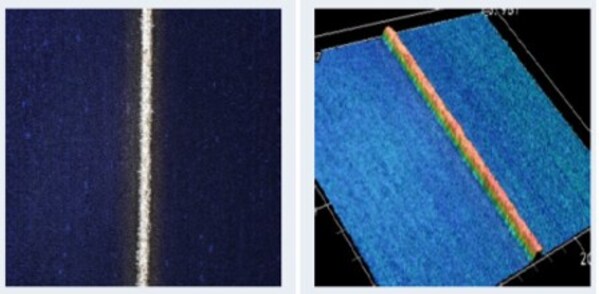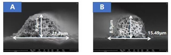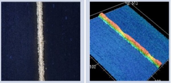 图2:左图为传统网版印刷下的栅线截面;右图为全开口网版印刷下的栅线截面