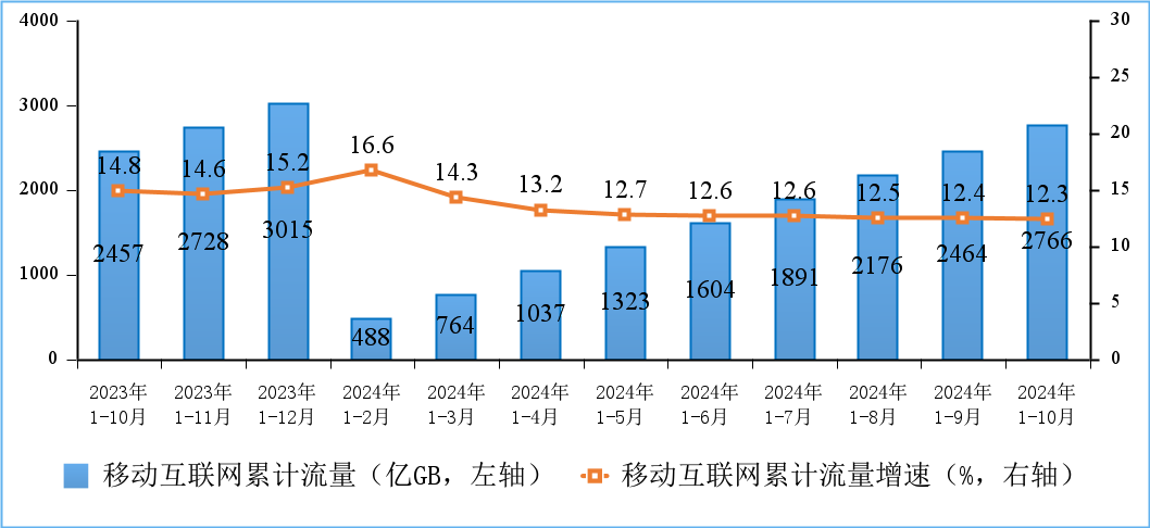注:1.自2024年2月起,将中国广播电视网络集团有限公司(简称中国广电)的5G移动电话用户数、5G移动互联网接入流量、5G移动互联网用户数纳入行业汇总数据,上年同期数据进行同步调整。