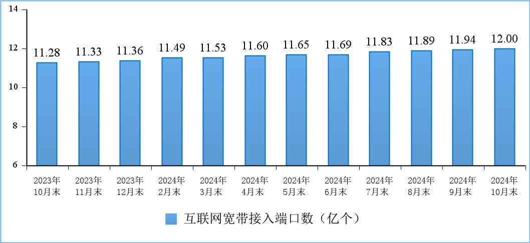千兆光纤宽带网络建设稳步推进。截至10月末,全国互联网宽带接入端口数量达12亿个,比上年末净增6370万个。其中,光纤接入(FTTH/O)端口达到11.6亿个,比上年末净增6141万个,占互联网宽带接入端口的96.4%。截至10月末,具备千兆网络服务能力的10GPON端口数达2761万个,比上年末净增458.6万个。