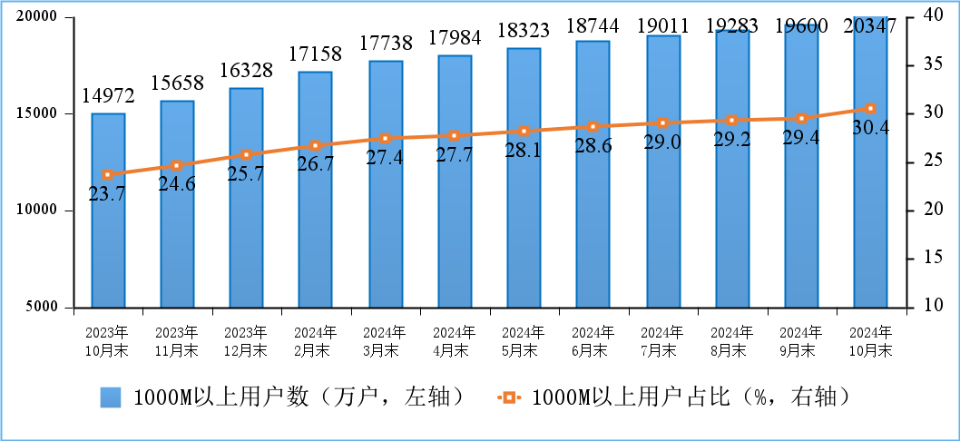 千兆用户占比超三成。截至10月末,三家基础电信企业的固定互联网宽带接入用户总数达6.68亿户,比上年末净增3204万户。其中,100Mbps及以上接入速率的固定互联网宽带接入用户达6.33亿户,占总用户数的94.8%;1000Mbps及以上接入速率的固定互联网宽带接入用户达2.03亿户,比上年末净增4020万户,占总用户数的30.4%,占比较上年末提升4.7个百分点。在高速率用户持续增长拉动下,家庭户均接入带宽达506.9Mbps/户,同比增长15.1%。