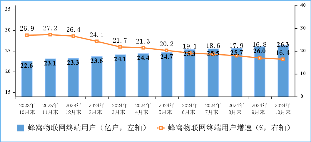 蜂窝物联网用户较快增长,IPTV(网络电视)用户稳步增加。截至10月末,三家基础电信企业发展蜂窝物联网终端用户26.25亿户,比上年末净增2.93亿户。IPTV(网络电视)总用户数达4.07亿户,比上年末净增592.1万户。