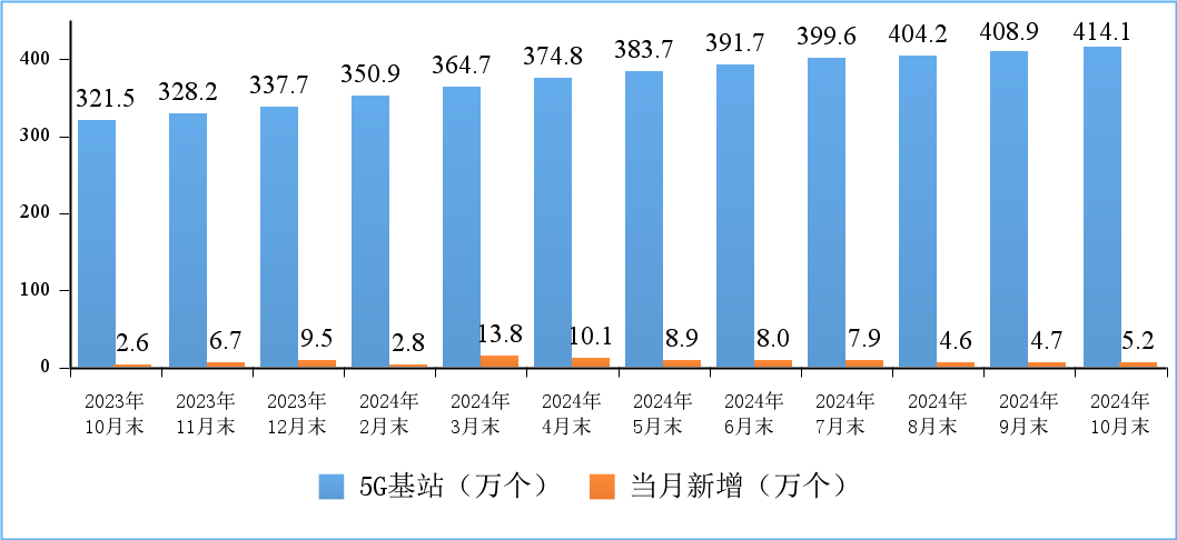 5G网络建设持续推进。截至10月末,5G基站总数达414.1万个,比上年末净增76.4万个,占移动基站总数的32.8%,占比较上年末提高3.7个百分点。