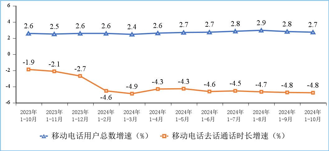 电话通话量持续下滑,移动短信业务量收小幅增长。前10个月,移动电话去话通话时长完成1.8万亿分钟,同比下降4.8%;固定电话主叫通话时长完成652亿分钟,同比下降1.9%。前10个月,全国移动短信业务量同比增长4.5%;移动短信业务收入同比增长3.4%。