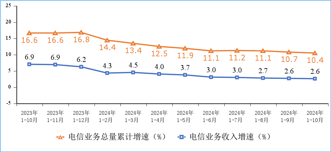 电信业务量收保持稳步增长。前10个月,电信业务收入累计完成14535亿元,同比增长2.6%。按照上年不变价计算的电信业务总量同比增长10.4%。