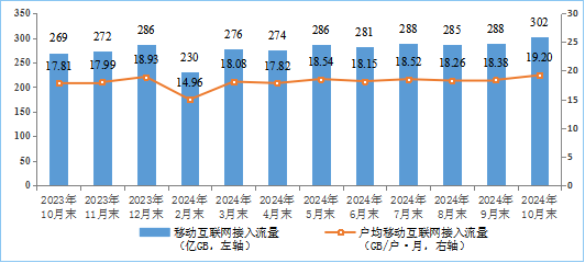 移动互联网流量较快增长,10月DOU值创新高。前10个月,移动互联网累计流量【见注1】达2766亿GB,同比增长12.3%。截至10月末,移动互联网用户数【见注1】达15.74亿户,比上年末净增5006万户。10月当月户均移动互联网接入流量(DOU)达到19.2GB/户·月,同比增长7.6%,比上年同期提高1.35GB/户·月。