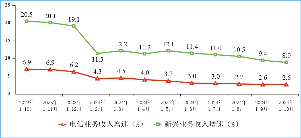 前10个月,通信业整体运行平稳。电信业务收入保持正增长,新兴业务持续发挥拉动作用;5G、千兆光网、物联网等网络基础设施建设稳步推进,连接用户规模持续扩大,移动互联网接入流量较快增长。