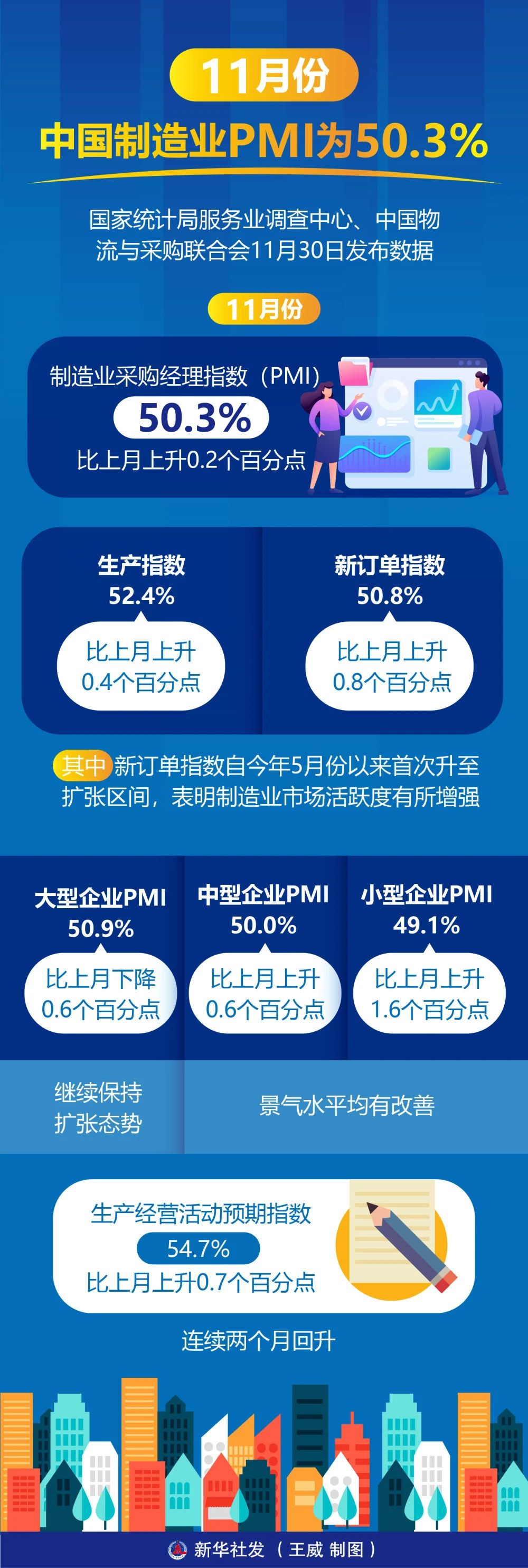 国家统计局服务业调查中心、中国物流与采购联合会11月30日发布数据,11月份,制造业采购经理指数(PMI)为50.3%,比上月上升0.2个百分点。