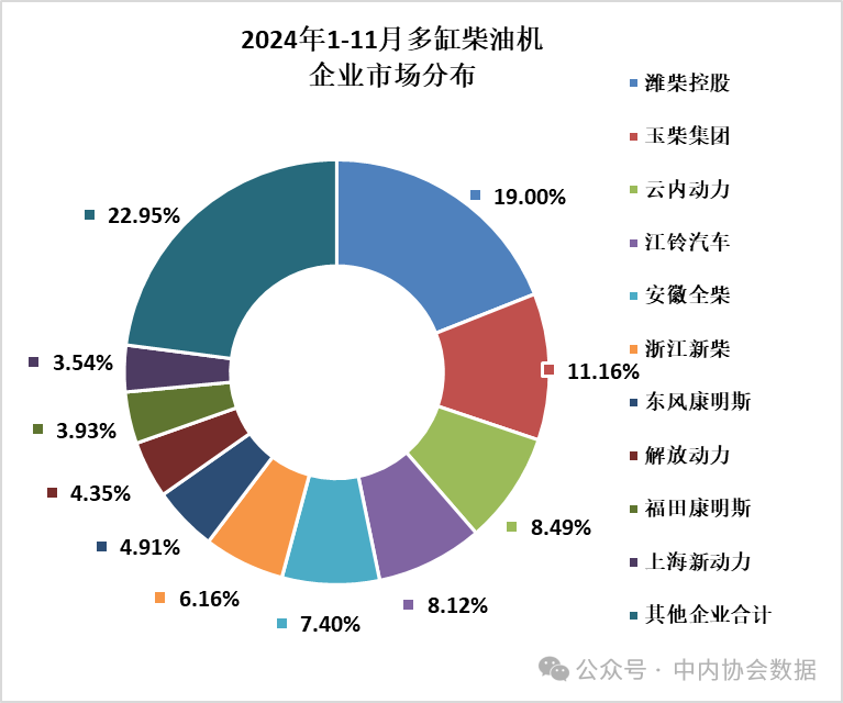 11月,多缸柴油机企业共销量32.96万台,环比增长13.98%,同比增长-7.11%;1-11月累计销量364.55万台,同比增长-3.90%。潍柴、玉柴、云内、江铃、全柴、新柴、东康、解放动力、福康、上海新动力销量居前十名,占多缸柴油机总销量的77.05%;市场份额占比中:潍柴19.00%、玉柴11.16%、云内8.49%、江铃8.12%、全柴7.40%、新柴6.16%、东康4.91%、解放动力4.35%、福康3.93%、上海新动力3.54%。