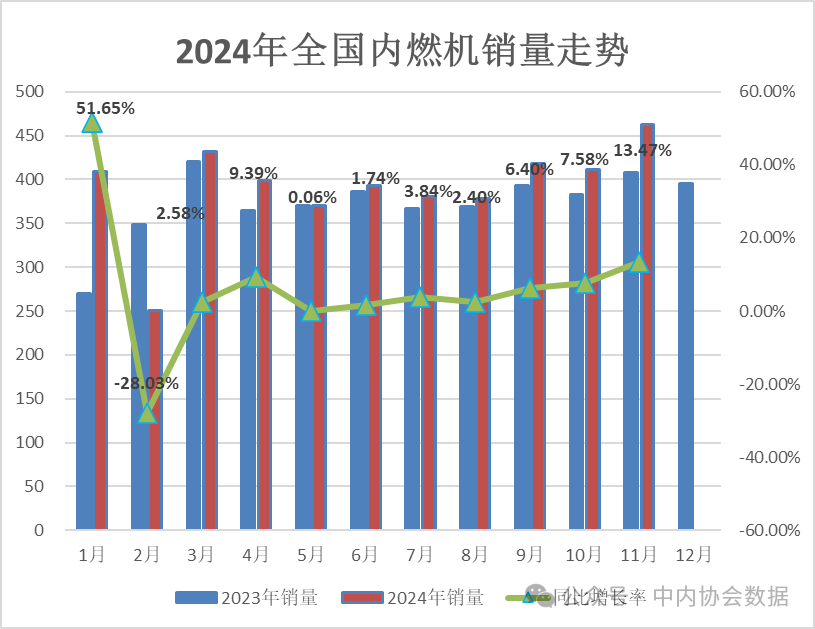 2024年11月内燃机行业销量环比、同比小幅增长;1-11月累计销量同比增长,较1-10月增幅略有扩大。