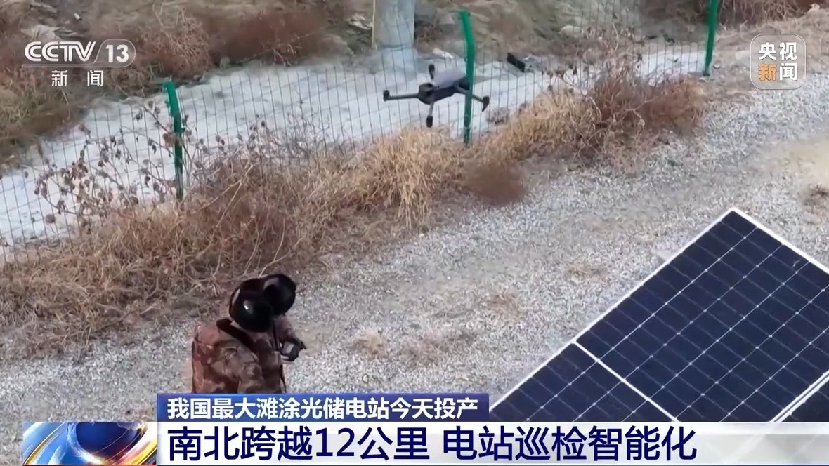 总台央视记者古峻岭:这里是我国最大滩涂光伏储能电站,整个项目占地面积1.8万亩,总共铺设了近200万块光伏板。全部投产后不仅能源源不断地提供清洁电力,还将在光伏板下灌注卤水,为当地群众产盐增收。