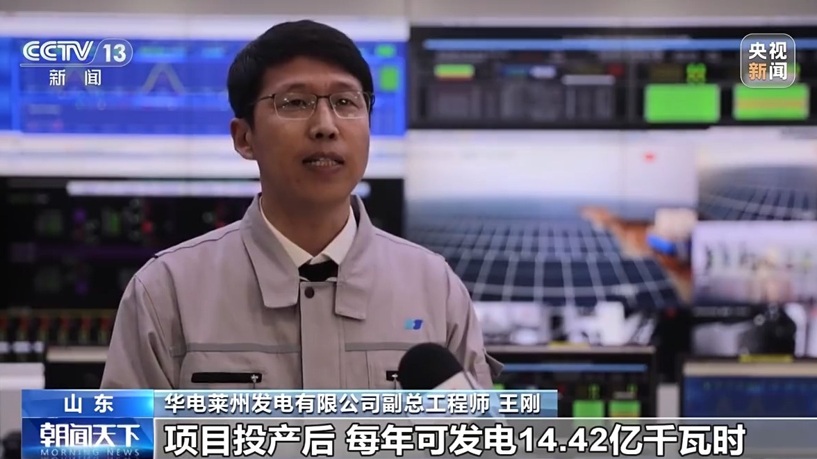 华电莱州发电有限公司副总工程师王刚:项目投产后,每年可发电14.42亿千瓦时,大约能满足50万户家庭一年的用电量。年节约标煤44.4万吨。