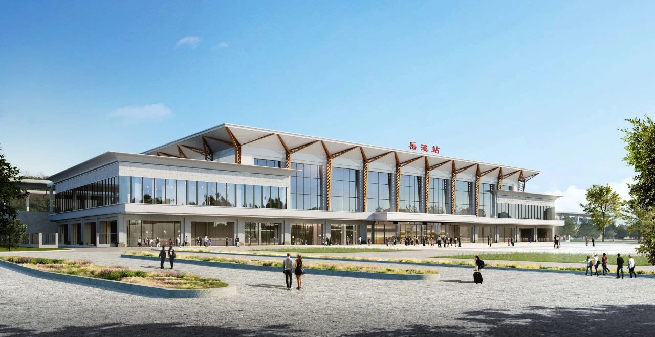 岳溪站位于重庆市开州区,建筑面积6000平方米,站场规模2台4线,为线侧下式站房。建筑造型整体呈现对称性,与当地文化、环境、风俗、地貌相和谐,展现舒展恢宏的建筑形态,山形起伏屋盖配以硬线条的基座部分展现出舒展轻盈又稳重的车站建筑形态。