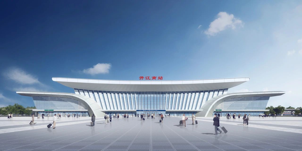 开者,张也,面向未来,张开怀抱。开江南站建筑屋顶提取开江的“开”字,双层飞翘的屋檐和挺拔的立柱抽象组成“开”字笔法,表达开江独特的区位特点和开放包容的城市文化,同时也是对开江开阔、开放、开创、开畅等城市性格的展现。