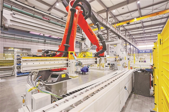 图为在哈尔滨电机厂有限责任公司线圈分厂智能制造车间,智能设备对绝缘线棒进行加工作业。新华社记者王松摄