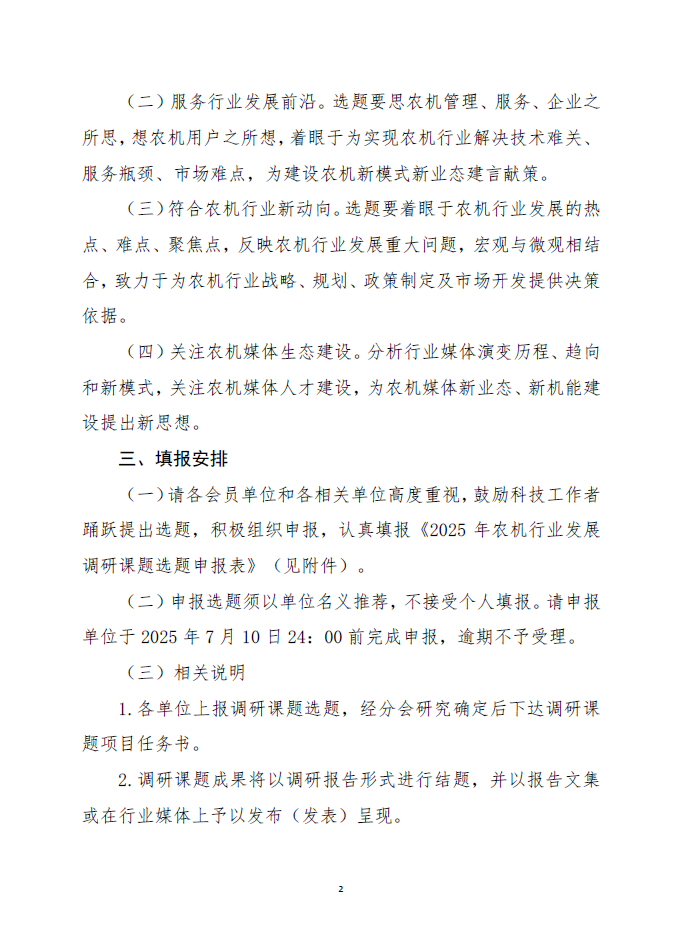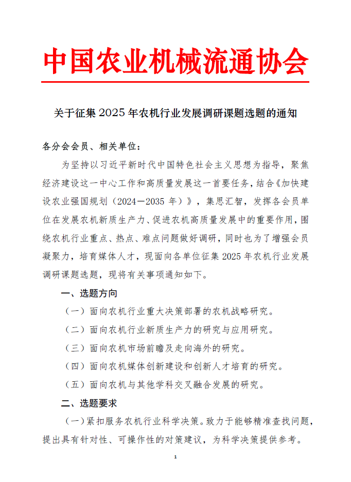 为集思汇智,发挥各会员单位在发展农机新质生产力、促进农机高质量发展中的重要作用,围绕农机行业重点、热点、难点问题做好调研,同时也为了增强会员凝聚力,培育媒体人才,中国农业机械流通协会现面向各单位征集2025年农机行业发展调研课题选题。正式文件如下。