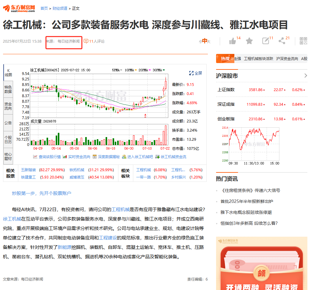 据每日经济新闻等多家财经媒体7月22日消息,徐工机械在互动平台回应投资者询问时明确表示,公司多款装备服务水电,深度参与川藏线、雅江水电项目,并成立西南研究院重点开展极端施工环境产品需求分析和技术研究。同日,同花顺等多款证券软件添加徐工机械“雅下水电概念股”。