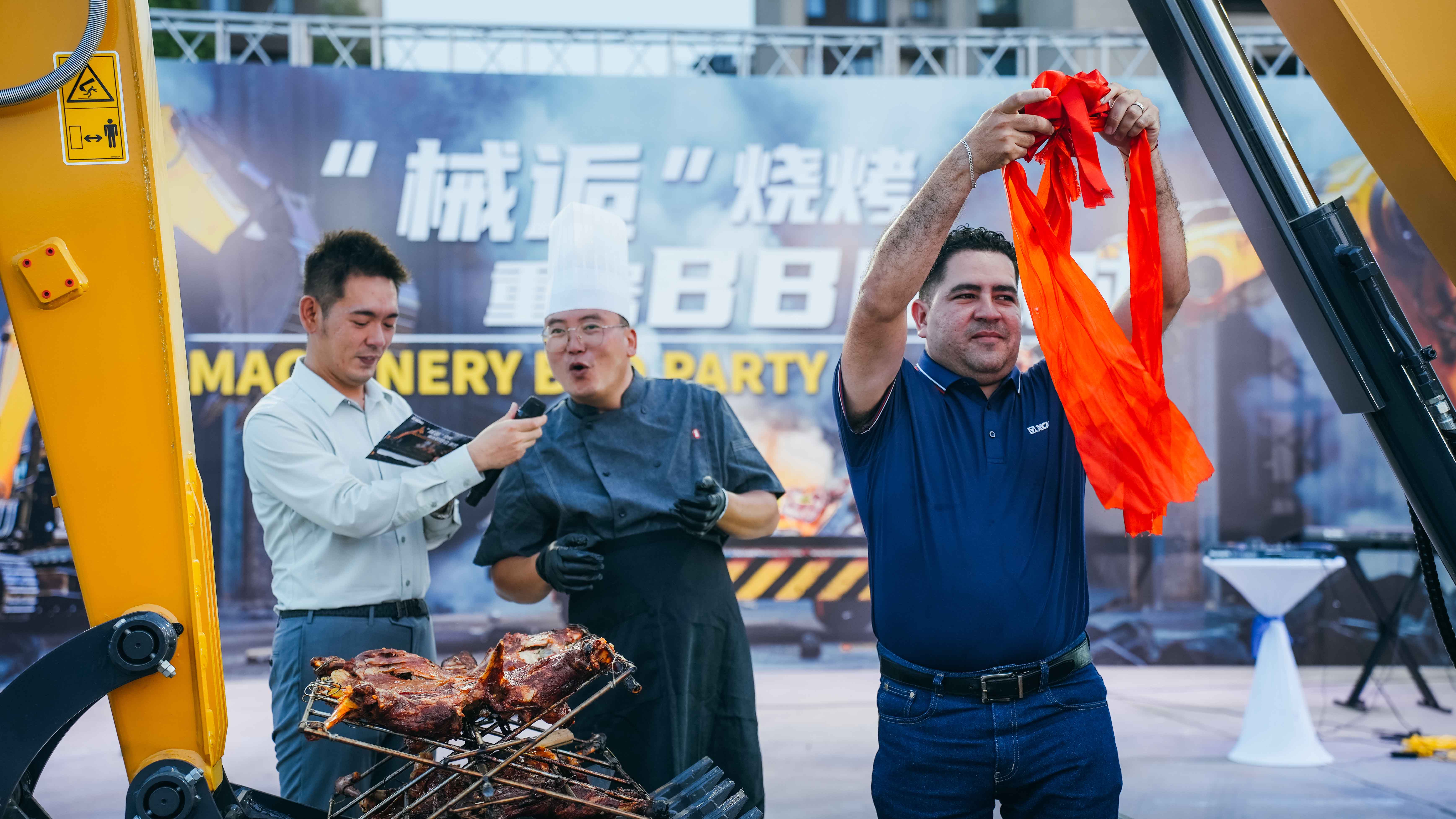 随着小挖机缓缓驶入,烤全羊身披红花,徐州大厨执“解羊刀”登场,来自中美洲大区的服务工程师GersonMejia上台与大厨参与互动,五湖四海的服务技能精英们首次体验了这满满的意识感。大家不禁赞叹:“这场BBQ仪式很特别,徐州BBQ,nice!”