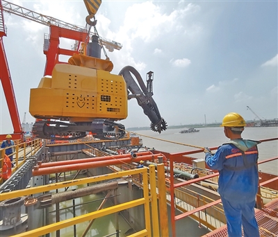 李杰介绍:“原来进行1个作业面作业需要6个人操作,每个小时只能绞吸黏土40立方米左右。有了这款智能取土机器人,只需要一个人操作,取土效率达到每小时200立方米,让主塔沉井的取土下沉就位作业提前两个月完成。”