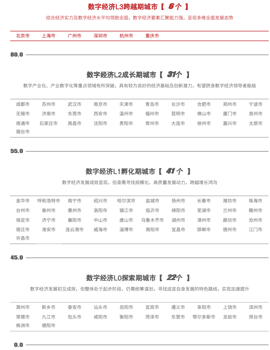 L3跨越期(6座城市):该梯队城市数字经济总分均超过80分,是中国数字经济的“极核”。其典型特征为四项指标得分均衡且无一短板,已成为具有全球影响力的数字技术创新策源地和要素汇聚地。北京、上海、广州、深圳等国家中心城市或一线超大城市位于该等级,体现了数字经济与城市能级的高度相关性。