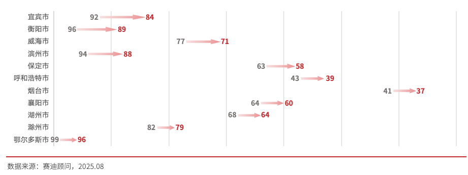 2025年,数字经济百强市呈现整体趋进的显著特征,40个城市实现位次上升,29个城市排名与上一年持平,31个城市位次下滑。整体来看,中游和后发城市间竞争更为激烈,数字经济排名上升幅度最大的11个城市中,有9个城市在50名以后。呼和浩特市抢抓国家实施“东数西算”工程重大机遇,加快构建“绿色算力—人工智能—智慧应用”全产业链,2024年,呼和浩特市数字经济核心产业增加值达到172亿元,占GDP比例达4.2%;宜宾市积极布局数字经济产业,培育创新生态,推动数字技术与实体经济深度融合,取得显著成效,024年新增数字经济企业53个,获批全国第二批中小企业数字化转型试点城市,国家级成渝地区电子信息先进制造集群重点支撑市;衡阳市出台全省首个地市级数字化转型专项政策,2024年新增的142家智能制造企业、179条智能产线、1165个智能工位,企业上云数量突破9807家,上平台企业达2048家,4项核心指标完成率挺进全省前四。