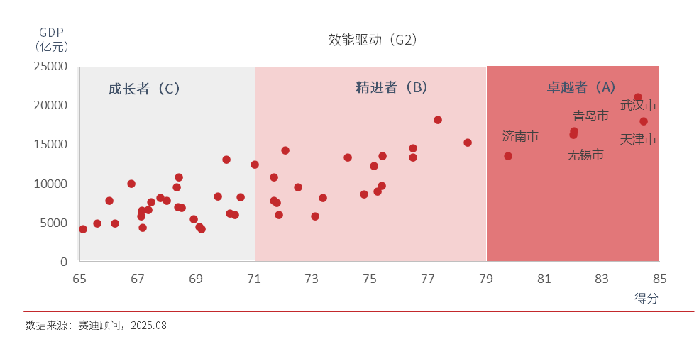2025年《报告》将能力搭建(G1)和效能驱动(G2)阶段的城市进一步细分为卓越者(A)、精进者(B)和成长者(C)三个等级。能力搭建阶段的卓越者城市实现能力跃升,数字基础设施加快实现全域覆盖,治理和服务基本实现线上化、协同化。典型卓越者城市如沧州市、保定市、济宁市、镇江市、漳州市等。效能驱动阶段的卓越者城市已形成基础设施全域覆盖、治理服务“智能决策”“无感办理”、产业数字化深度渗透等先进模式和成效。典型卓越者城市如武汉市、天津市、青岛市、无锡市、济南市等。