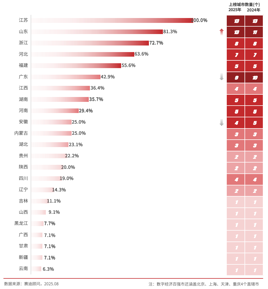 2025年数字经济百强市中,除海南、宁夏、青海、西藏四省(区)外,其他各省(市、区)均有城市上榜,四个直辖市全部上榜,其中江苏连续5年所辖城市均位列百强,数字经济发展水平保持全国领先。从省(市、区)上榜数字经济百强市城市数量变化情况来看:山东上榜城市数量增加2个,广东、安徽两省上榜城市数量各减少一个,其余省份保持稳定,整体呈现区域分布相对稳定、局部微调的态势。