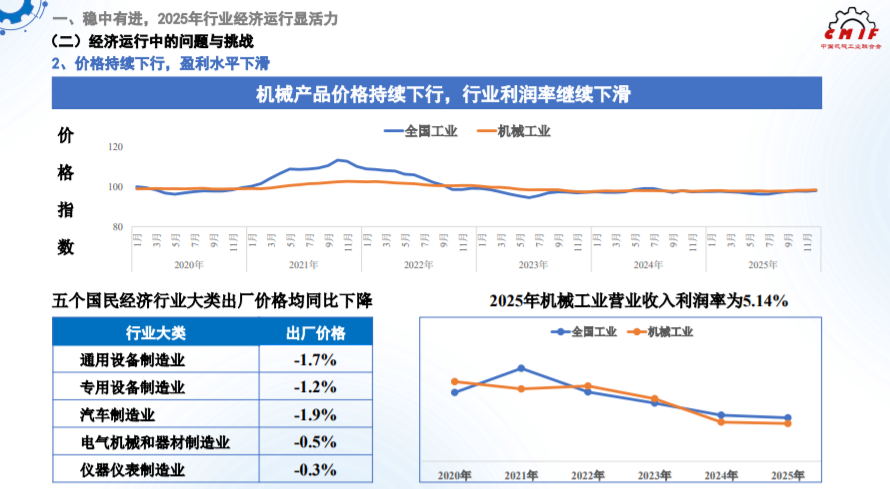 主要涉及的五个国民经济行业大类出厂价格均同比下降,通用设备、专用设备、汽车、电气机械和仪器仪表制造业出厂价格同比分别下降1.7%、1.2%、1.9%、0.5%和0.3%。行业利润率继续下滑,2025年机械工业营业收入利润率为5.14%,较上年下滑0.04个百分点,低于同期全国工业0.17个百分点。化解行业供需结构性矛盾、综合治理“内卷”任务依然艰巨。