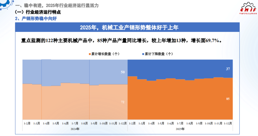 2025年,在“两重”“两新”等政策带动下,机械工业产销形势整体好于上年。重点监测的122种主要机械产品中,85种产品产量同比增长,较上年增加13种,增长面69.7%。