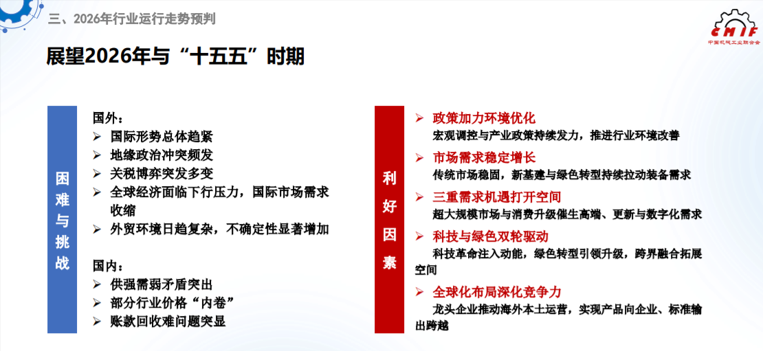 展望2026年乃至“十五五”时期,我国机械工业发展面临的外部环境变化影响加深、风险挑战增多。国际形势总体趋紧,地缘政治冲突频发,关税博弈突发多变,全球经济面临下行压力,国际市场需求收缩,外贸环境日趋复杂,不确定性显著增加。国内供强需弱矛盾突出,部分行业价格“内卷”和账款回收难问题突显。但支撑行业高质量发展的有利条件也在不断积累和增多。