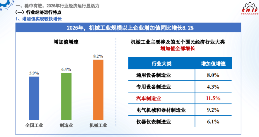 2025年,机械工业认真贯彻落实党中央、国务院决策部署,迎难而上、奋力拼搏,在国家“两重”“两新”等一系列稳增长政策措施支持下,行业经济运行稳中有进,高质量发展取得积极成效,圆满完成全年和“十四五”规划目标任务。
