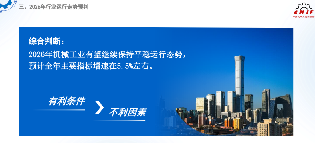 综合来看,2026年机械工业发展机遇与挑战并存,但有利条件总体强于不利因素。随着党的二十届四中全会关于建设现代化产业体系等战略部署的落实,以及中央经济工作会议稳增长、促转型相关政策的发力,机械工业有望继续保持平稳运行态势,预计全年主要指标增速在5.5%左右。