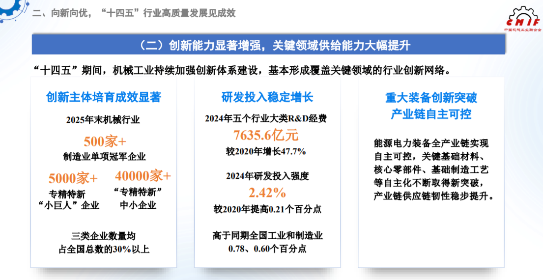“十四五”期间,机械工业持续加强创新体系建设,基本形成覆盖关键领域的行业创新网络。