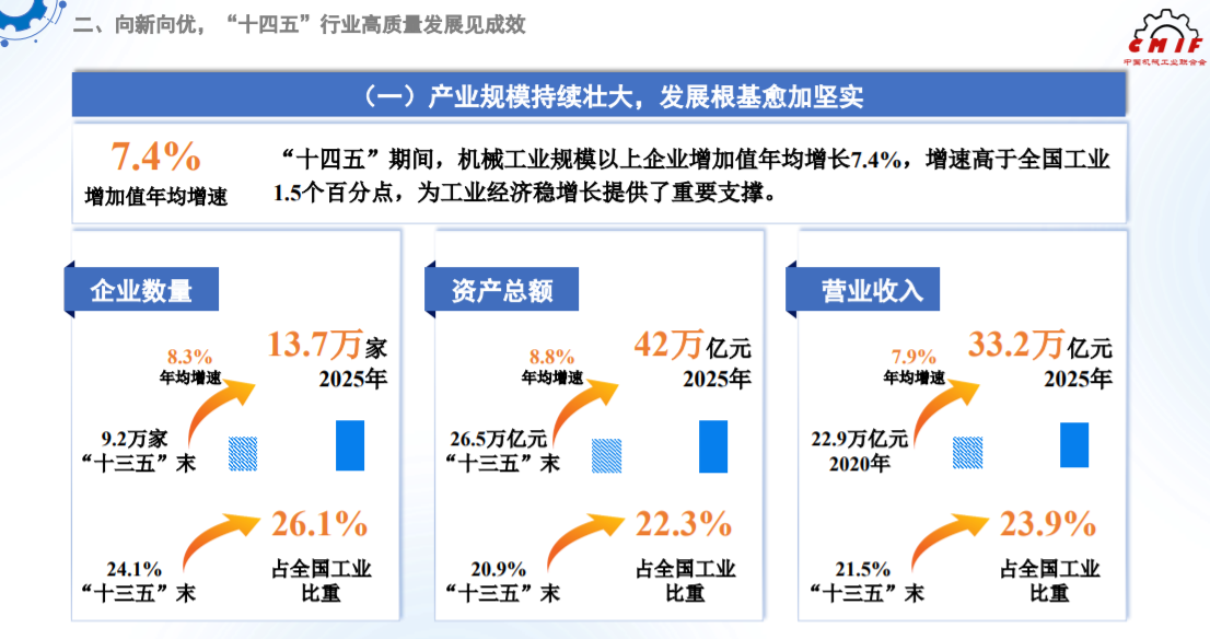 “十四五”期间,机械工业规模以上企业增加值年均增长7.4%,增速高于全国工业1.5个百分点,为工业经济稳增长提供了重要支撑。