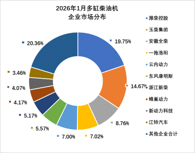 1月,多缸柴油机企业共计销量42.27万台,环比增长17.41%,同比增长24.90%。潍柴、玉柴、全柴、一拖、云内、东康、新柴、蜂巢动力、新动力科技、江铃销量居前十名,占多缸柴油机总销量的79.64%;市场份额占比中:潍柴19.75%、玉柴14.67%、全柴8.76%、一拖7.02%、云内7.00%、东康5.57%、新柴5.17%、蜂巢动力4.17%、新动力科技4.07%、江铃3.46%。