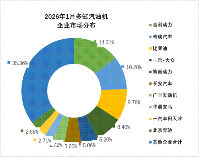 乘用车用在多缸汽油机占比为97.17%,1月销量146.60万台,环比增长-17.69%,同比增长-0.76%。吉利、奇瑞、比亚迪、一汽-大众、蜂巢动力、长安汽车、广丰发动机、华晨宝马、一汽丰田天津、北京奔驰销量排在前列。
