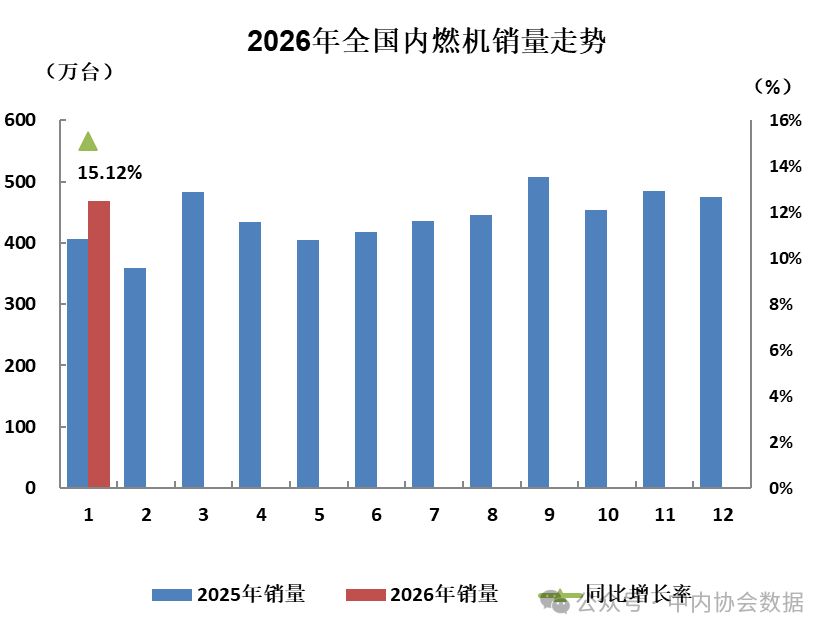 经过2026年1月政策的切换和调整,部分消费需求提前释放,消费者观望等待,一定程度影响了市场销量,但上年同期有效工作日少,并且在摩托车行业强势带动下,内燃机行业展现出强大的发展韧性和活力,内燃机市场开年良好运行。根据中国内燃机工业协会最新数据显示,1月内燃机销量467.61万台,环比增长-1.46%,同比增长15.02%。