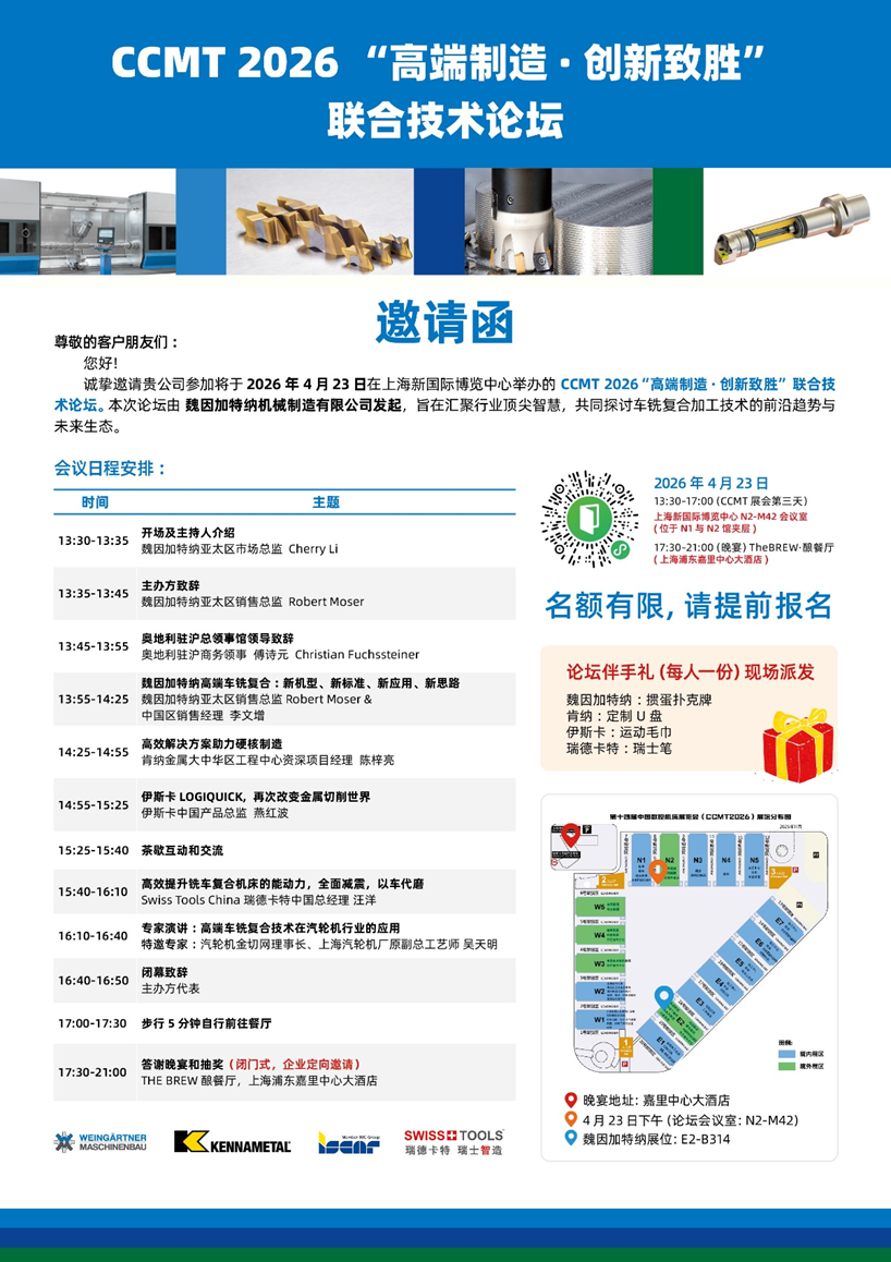 2026年4月23日,“高端制造·创新致胜”联合技术论坛将在第十四届中国数控机床展览会(CCMT2026)期间举办。